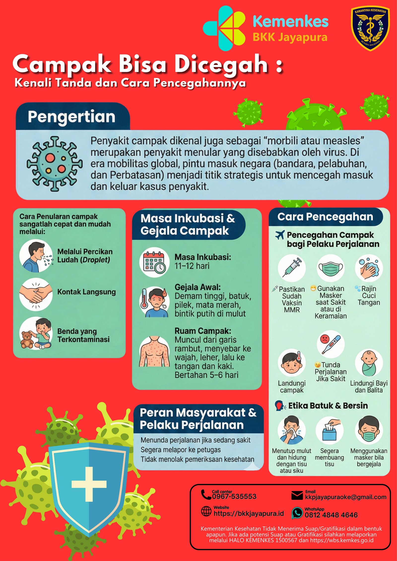 Campak merupakan penyakit menular yang menyebar melalui percikan batuk dan bersin, serta berisiko menimbulkan KLB bila tidak dikendalikan dengan baik.Sebagai garda terdepan di pintu masuk negara, Bala