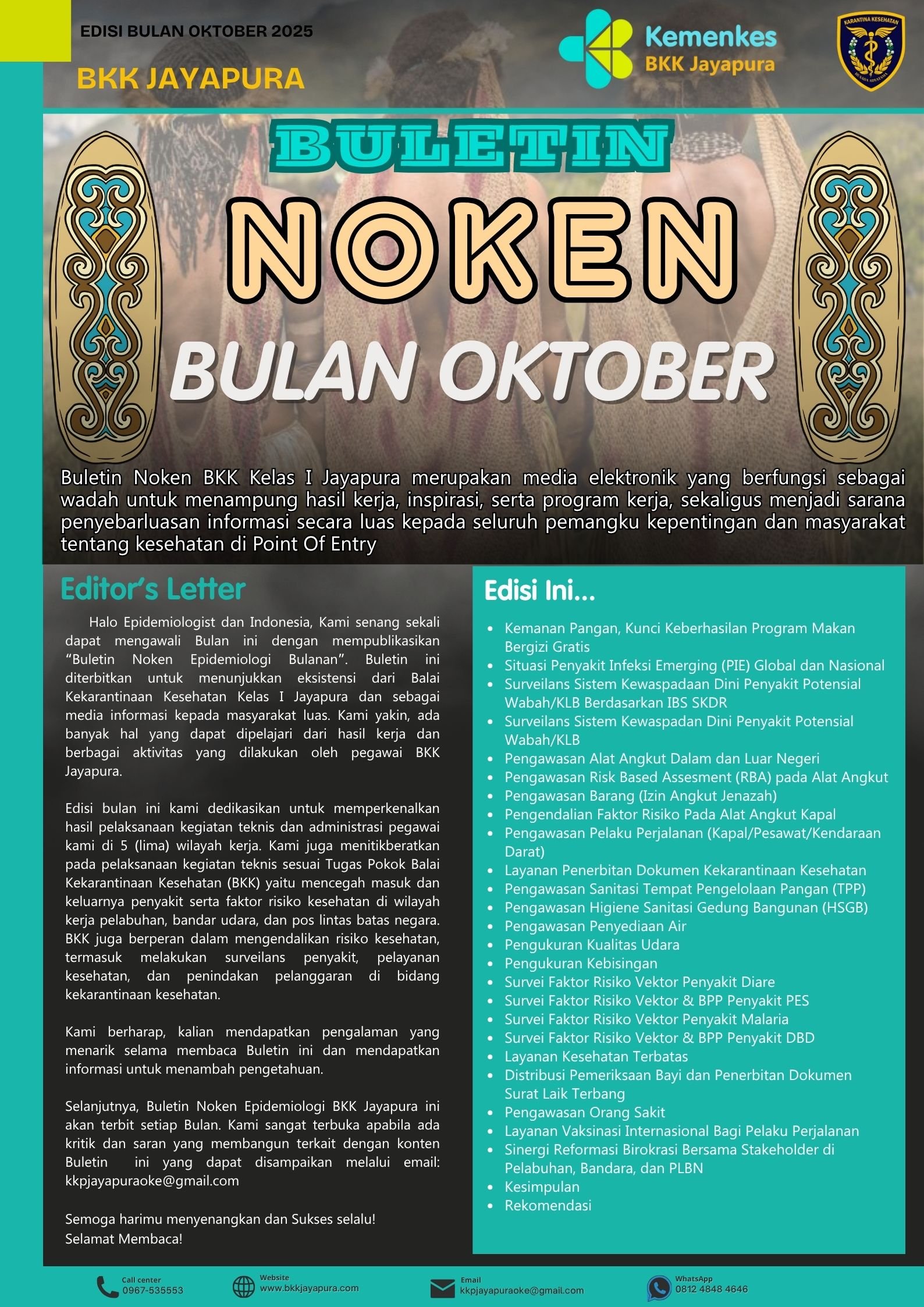 Buletin Noken BKK Kelas I Jayapura merupakan media elektronik yang berfungsi sebagai wadah untuk menampung hasil kerja, inspirasi, serta program kerja, sekaligus menjadi sarana penyebarluasan informasi secara luas kepada seluruh pemangku kepentingan dan masyarakat tentang kesehatan di Point Of Entry