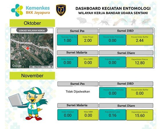 Pelaksanaan survei vektor penyakit Pes melalui pemasangan perangkap pada bulan Oktober sebanyak 100 perangkap dengan hasil tikus tertangkap sebanyak 1 tikus betina yang berjenis Rattus tanezumi 1 ekor dan dilakukan penyisiran guna mengetahui keberadaan ektoparasit dengan hasil ditemukan 2 pinjal Xenopsylla cheopis, sedangkan untuk bulan November tidak dijadwalkan pemasangan perangkap tikus. Survei vektor penyakit DBD atau pengamatan jentik Aedes spp, bulan Oktober dan November mencakup dengan area Perimeter yang tiap bulan pengamatan dengan jumlah bangunan dan container yang sama yaitu dengan jumlah 15 bangunan dan 41 contaniner dengan hasil tidak ditemukan bangunan dan contaniner positif jentik pada bulan Oktober dan November. Sedangkan untuk area Buffer dengan masing-masing bulan mengamati bangunan dan container yang sama dengan jumlah 41 bangunan dan 58 container dengan hasil ditemukan 1 bangunan positif jentik dan 1 container yang positif jentik pada bulan Oktober sedangkan pada bulan November tidak ditemukan bangunan dan container yang positif jentik. Survei vektor penyakit Malaria dilakukan melalui pengamatan habitat potensial jentik Anopheles spp dengan jumlah habitat yang diamati sebanyak 3 habitat tiap bulannya di area Buffer dengan hasil tidak ditemukan habitat positif jentik. Survei vektor penyakit Malaria juga mencakup pengamatan nyamuk Anopheles spp pada malam hari dengan pelaksanaan bulan Oktober dan November di area Perimeter sebanyak 3 petugas dengan yang bertindak sebagai kolektor 2 orang dengan hasil tidak ditemukan nyamuk Anopheles spp. Untuk di area Buffer sebanyak 2 kolektor dengan hasil juga tidak ditemukan nyamuk Anopheles spp. Adapun survei vektor penyakit Diare dilaksanakan melalui pengamatan kepadatan lalat dan kecoa. Hasil pengamatan kepadatan lalat tiap bulannya mengamati lokasi yang sama yaitu di 10 lokasi dengan seluruh lokasi masuk kategori kepadatan rendah. Sedangkan untuk pengamatan kepadatan kecoa dilaksanakan di 1 lokasi dengan hasil 1 lokasi kategori kepadatan tinggi.
