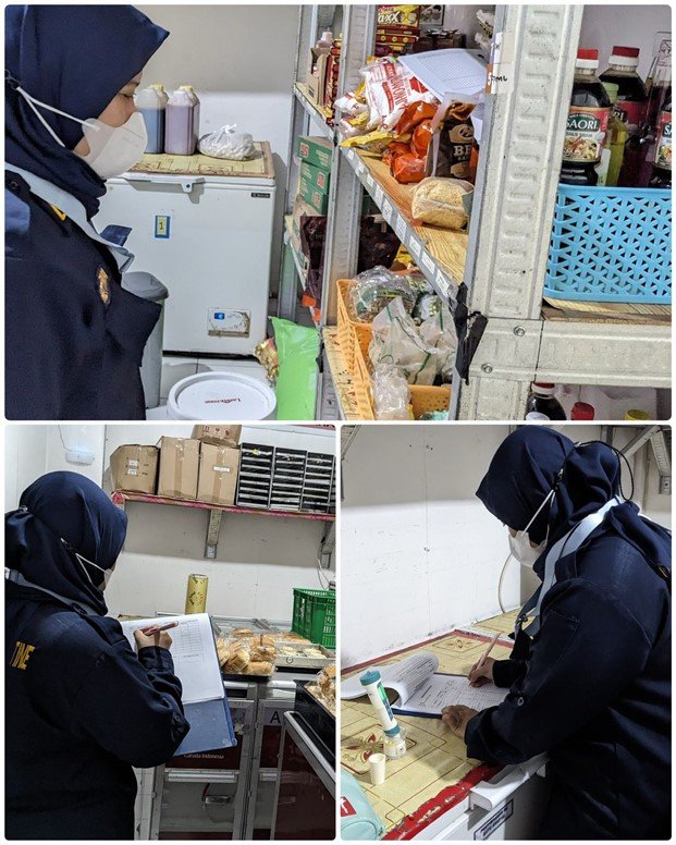 Pemeriksaan dilakukan dengan observasi langsung menggunakan formulir inspeksi kesehatan lingkungan jasaboga dan pengujian sampel pangan secara organoleptik (warna, bau, rasa, tekstur) dan air secara fisik (warna, rasa, bau, kejernihan, suhu, TDS) dan kimia sederhana (pH).