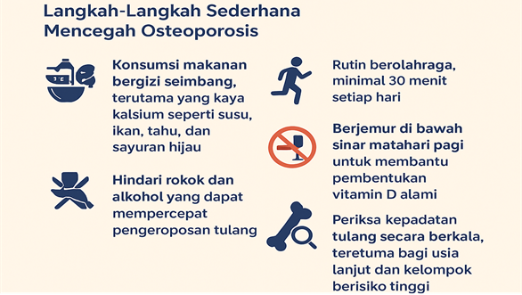 Osteoporosis dapat dicegah dengan membangun kebiasaan yang sehat secara konsisten setiap hari, antara lain: