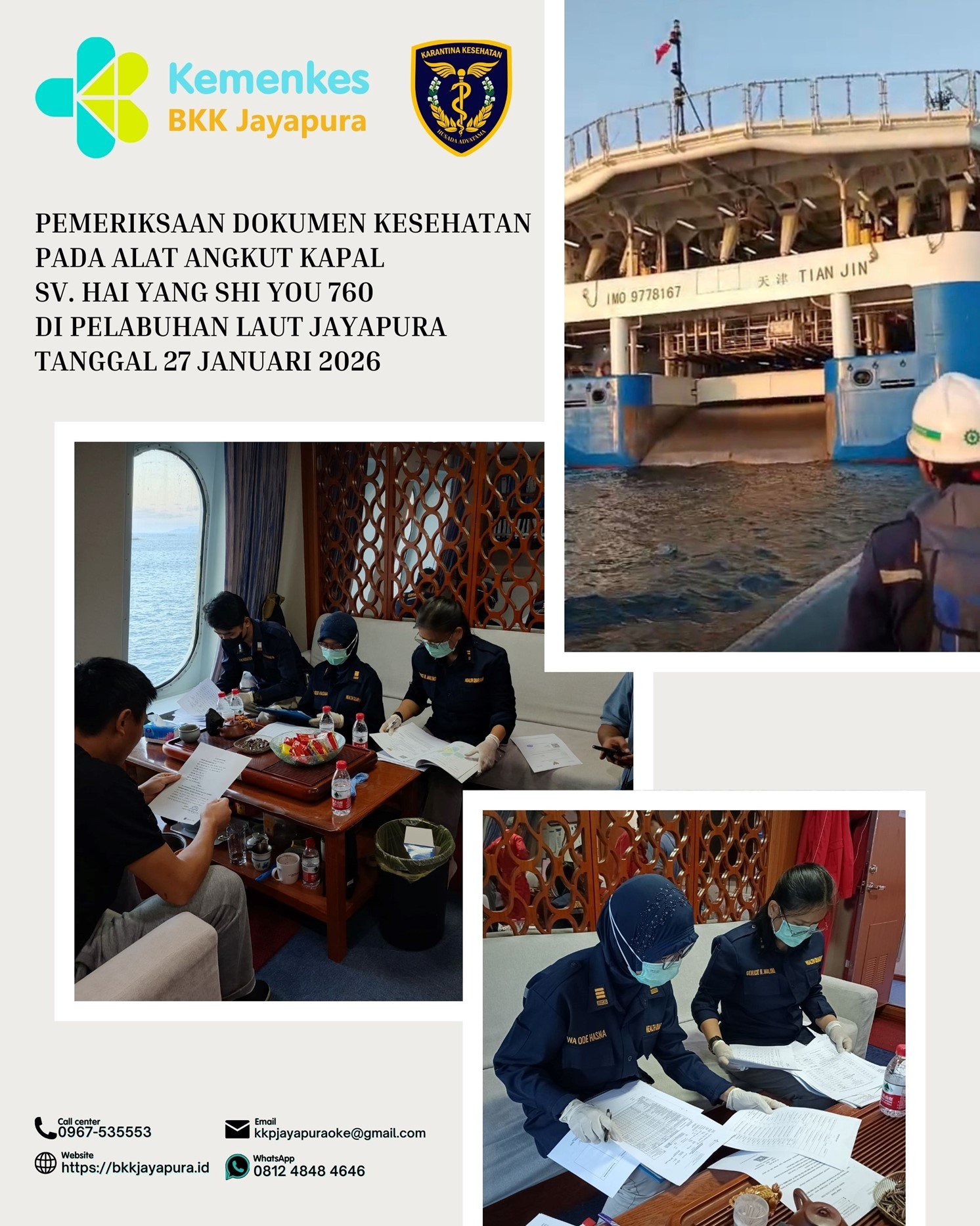 Pada hari Selasa, 27 Januari 2026, petugas dari Balai Kekarantinaan Kesehatan (BKK) Kelas I Jayapura melaksanakan prosedur pengawasan dan pemeriksaan kesehatan terhadap kapal riset/survei SV. Hai Yang Shi You 760. Kapal berbendera Tiongkok dengan nomor IMO 9778167 ini menjalani pemeriksaan rutin saat berlabuh di Pelabuhan Laut Jayapura guna memastikan pemenuhan standar kesehatan pelabuhan internasional.