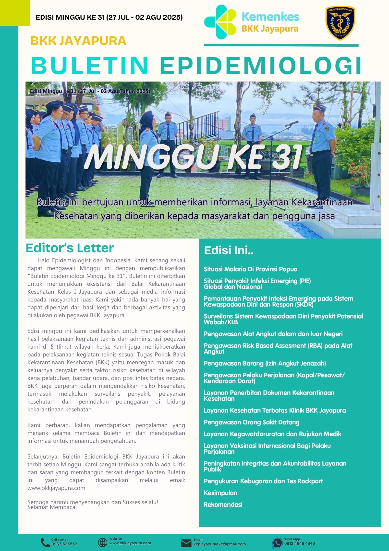 Halo Epidemiologist dan Indonesia, Kami senang sekali dapat mengawali Minggu ini dengan mempublikasikan “Buletin Epidemiologi Minggu ke 31 (27 Juli s.d 02 Agustus) tahun 2024”. Buletin ini diterbitkan untuk menunjukkan eksistensi dari Balai Kekarantinaan Kesehatan Kelas I Jayapura dan sebagai media informasi kepada masyarakat luas. Kami yakin, ada banyak hal yang dapat dipelajari dari hasil kerja dan berbagai aktivitas yang dilakukan oleh pegawai BKK Jayapura.