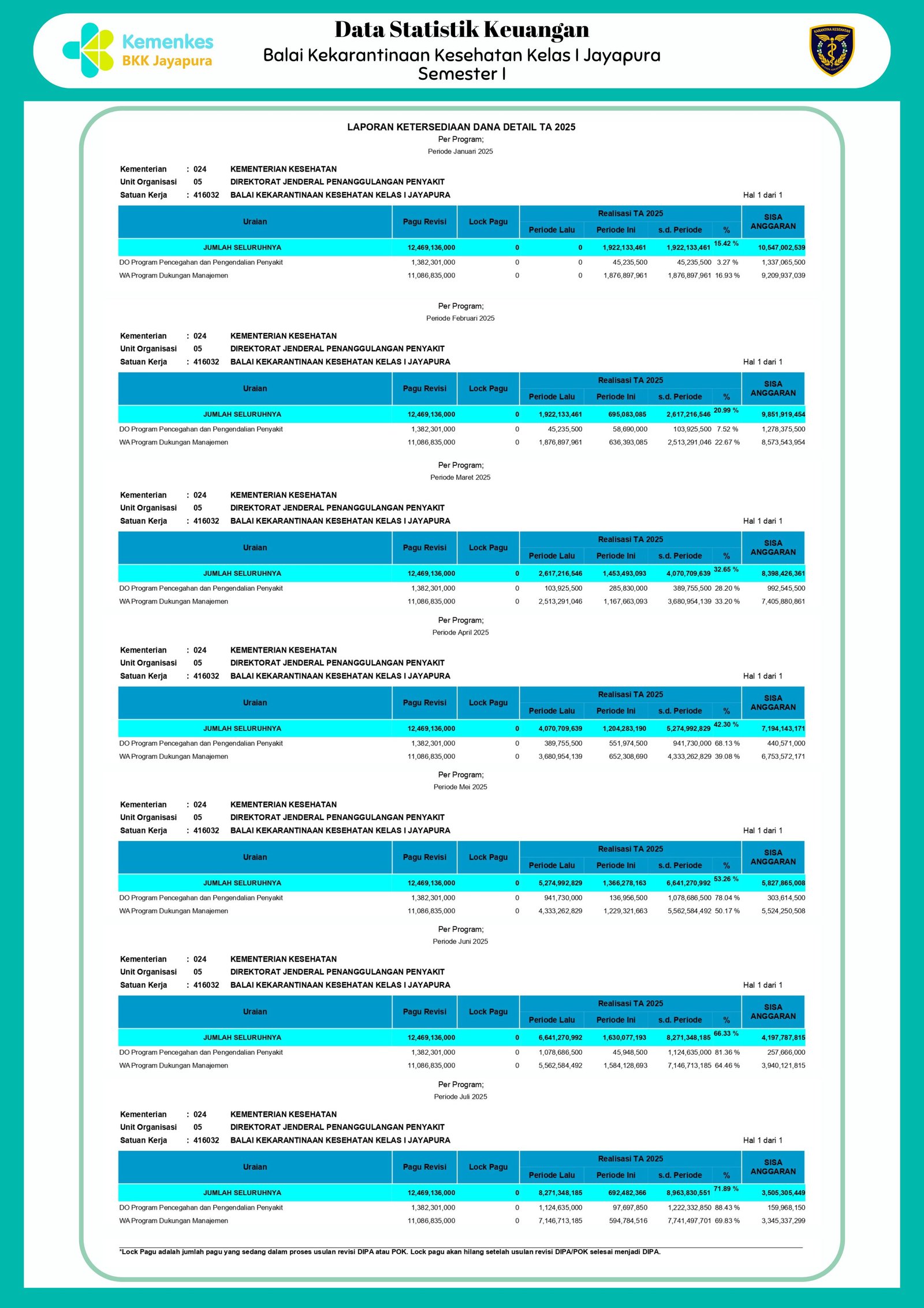 Data Statistik Keuangan di lingkungan Balai Kekarantinaan Kesehatan Kelas I Jayapura untuk periode Semester I Tahun Anggaran 2025.