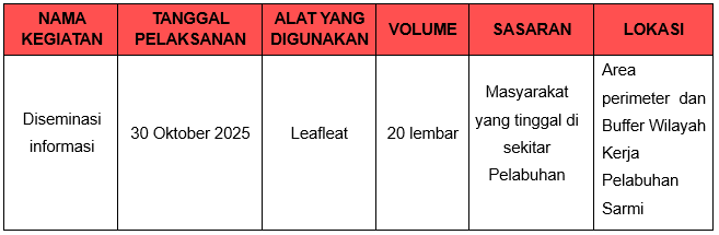 Berdasarkan tabel diatas, diketahui telah dilakukan diseminasi informasi tentang gejala, cara penularan, dan pencegahan penyakit malaria kepada masyarakat sekitar Pelabuhan Sarmi pada tanggal 30 Oktober 2025. Sasaran dari desiminasi yang dilakukan adalah masyarakat yang tinggal di sekitar Pelabuhan. Proses diseminasi dilakukan dengan membagikan leaflet yang memuat berbagai informasi penting, antara lain pengertian penyakit malaria, bagaimana cara penularan, gejala malaria tanpa komplikasi (ringan), gejala malaria berat, cara minum obat malaria yang benar, serta pencegahan penyakit malaria.
