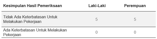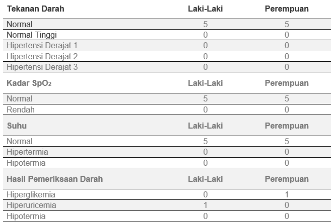 Kegiatan pemeriksaan kesehatan pada penjamah makanan dilaksanakan pada tanggal 02 September 2025 dengan jumlah penjamah makanan yang diperiksa sebanyak 10 orang. Kegiatan dilakukan pada Tempat Pengelolaan Pangan (TPP) di Wilayah Kerja Pos Lintas Batas Negara Skouw dan didapatkan hasil pemeriksaan sebagai berikut: