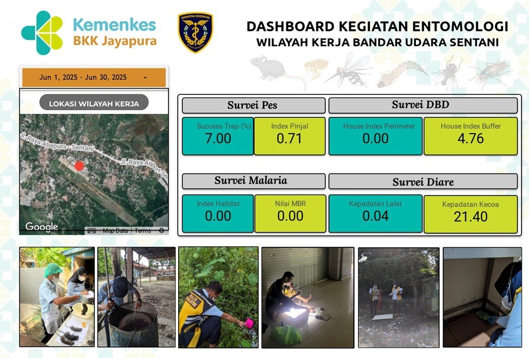 Status keberadaan dan kepadatan vektor penyakit diketahui dengan melaksanakan pemasangan perangkap dan identifikasi tikus serta pinjal, survei jentik Aedes spp, survei habitat potensial jentik Anopheles spp, survei nyamuk Anopheles spp pada malam hari, pengukuran kepadatan lalat dan kecoa. Seluruh kegiatan tersebut dilaksanakan pada bulan Juni tahun 2025 di wilayah kerja Bandar Udara Sentani dengan metode pengamatan langsung yang kemudian dicatat pada formulir pengamatan sebagai instrumen pengumpulan data.