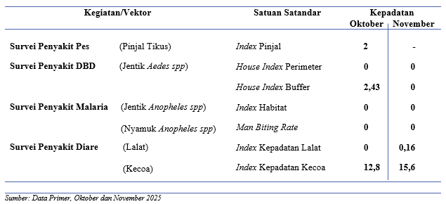 Pelaksanaan survei vektor penyakit Pes melalui pemasangan perangkap pada bulan Oktober sebanyak 100 perangkap dengan hasil tikus tertangkap sebanyak 1 tikus betina yang berjenis Rattus tanezumi 1 ekor dan dilakukan penyisiran guna mengetahui keberadaan ektoparasit dengan hasil ditemukan 2 pinjal Xenopsylla cheopis, sedangkan untuk bulan November tidak dijadwalkan pemasangan perangkap tikus. Survei vektor penyakit DBD atau pengamatan jentik Aedes spp, bulan Oktober dan November mencakup dengan area Perimeter yang tiap bulan pengamatan dengan jumlah bangunan dan container yang sama yaitu dengan jumlah 15 bangunan dan 41 contaniner dengan hasil tidak ditemukan bangunan dan contaniner positif jentik pada bulan Oktober dan November. Sedangkan untuk area Buffer dengan masing-masing bulan mengamati bangunan dan container yang sama dengan jumlah 41 bangunan dan 58 container dengan hasil ditemukan 1 bangunan positif jentik dan 1 container yang positif jentik pada bulan Oktober sedangkan pada bulan November tidak ditemukan bangunan dan container yang positif jentik. Survei vektor penyakit Malaria dilakukan melalui pengamatan habitat potensial jentik Anopheles spp dengan jumlah habitat yang diamati sebanyak 3 habitat tiap bulannya di area Buffer dengan hasil tidak ditemukan habitat positif jentik. Survei vektor penyakit Malaria juga mencakup pengamatan nyamuk Anopheles spp pada malam hari dengan pelaksanaan bulan Oktober dan November di area Perimeter sebanyak 3 petugas dengan yang bertindak sebagai kolektor 2 orang dengan hasil tidak ditemukan nyamuk Anopheles spp. Untuk di area Buffer sebanyak 2 kolektor dengan hasil juga tidak ditemukan nyamuk Anopheles spp. Adapun survei vektor penyakit Diare dilaksanakan melalui pengamatan kepadatan lalat dan kecoa. Hasil pengamatan kepadatan lalat tiap bulannya mengamati lokasi yang sama yaitu di 10 lokasi dengan seluruh lokasi masuk kategori kepadatan rendah. Sedangkan untuk pengamatan kepadatan kecoa dilaksanakan di 1 lokasi dengan hasil 1 lokasi kategori kepadatan tinggi.