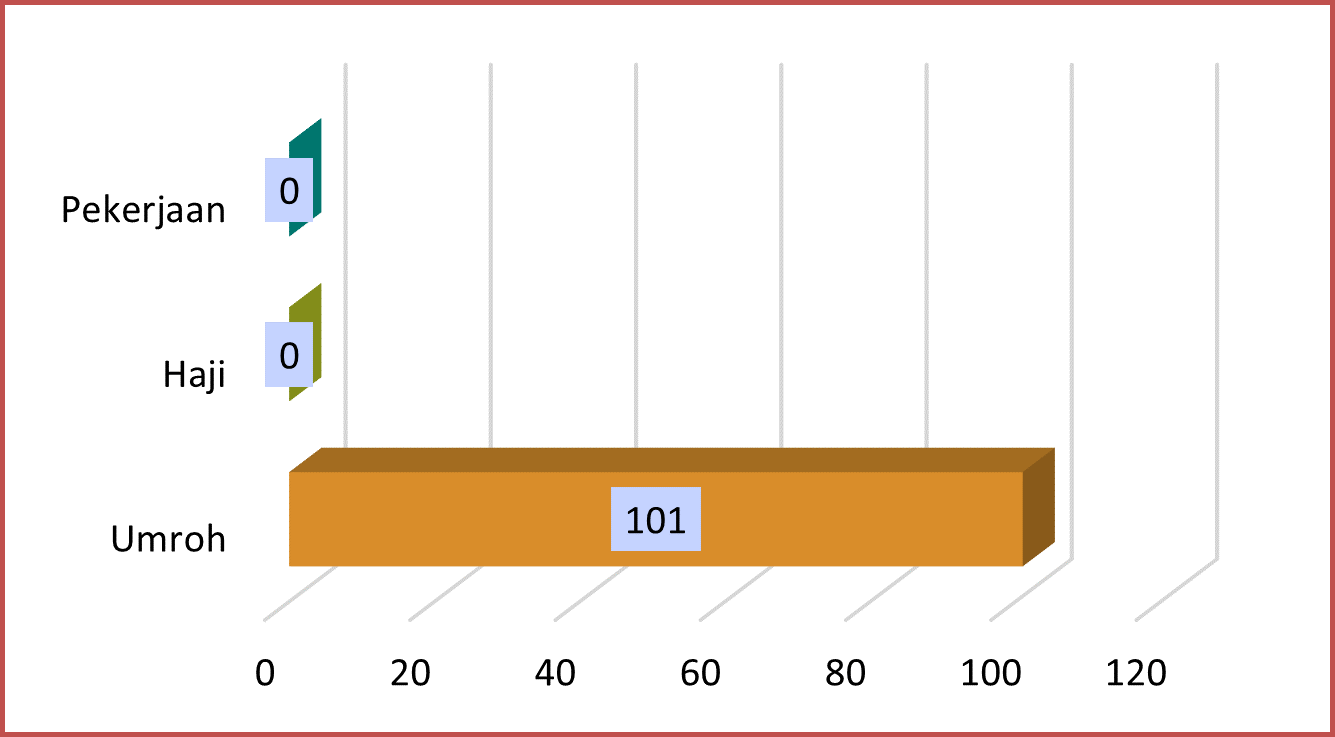Gambar grafik di atas menjelaskan distribusi para pelaku perjalanan internasional berdasarkan permintaan ICV pada vaksinasi di Kantor Balai Kekarantinaan Kesehatan Jayapura. Total permintaan sertifikat vaksinasi bulan Desember sebanyak 101 orang dan semuanya permintaan sertifikat untuk tujuan ibadah Umroh atau 100 %