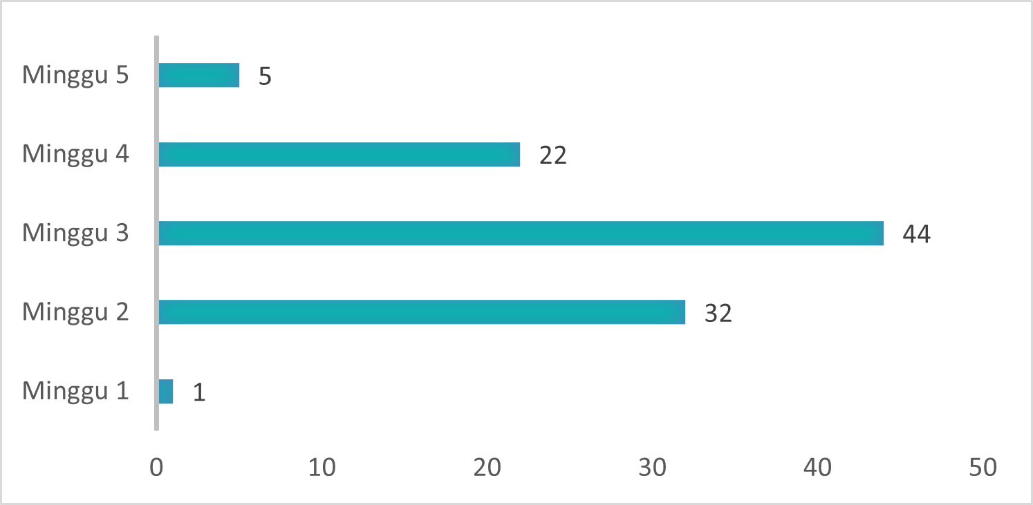 Gambar grafik di atas menjelaskan distribusi pelaku perjalanan internasional berdasarkan waktu selama bulan Desember 2025. Pada grafik tersebut dapat dilihat pelaku perjalananan yang datang untuk melakukan vaksinasi paling tinggi pada minggu ketiga yaitu sebanyak 44 orang atau 43 %.