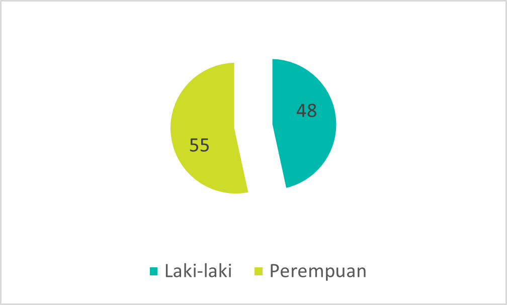 Gambar grafik di atas menjelaskan para pelaku perjalanan internasional yang melakukan vaksinasi bulan Desember 2025. Pada bulan ini jenis kelamin perempuan sebanyak 48 orang atau 46 % dan laki-laki sebanyak 55 orang atau 53%. Jenis kelamin tidak menjadi faktor penentu dalam pemberian vaksinasi. Vaksin diberikan kepada seluruh populasi tanpa membedakan jenis kelamin baik anak-anak, remaja dan dewasa (baik laki-laki maupun perempuan).