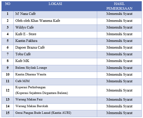 Pengawasan sanitasi TPP dilaksanakan pada hari Rabu, 12 November 2025 di wilayah perimeter dan buffer Bandar Udara Wamena. Pengawasan dilakukan terhadap 15 TPP yang 2 rumah makan golongan A1 dan 13 gerai pangan jajanan. Hasil pengawasan sanitasi TPP yaitu 15 TPP memenuhi syarat.