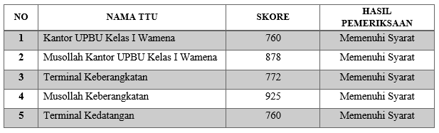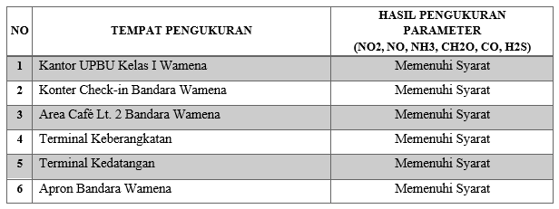 Berdasarkan hasil pengawasan dan pemeriksaan tempat-tempat umum dibandara baik pada terminal, tempat ibadah dan perkantoran serta pengukuran kualitas udara dengan parameter (NO2, NO, NH3, CH2O, CO, H2S) seluruhnya memenuhi syarat, menunjukkan bahwa lingkungan Bandar Udara Wamena telah memenuhi standar kesehatan dan sanitasi yang ditetapkan.